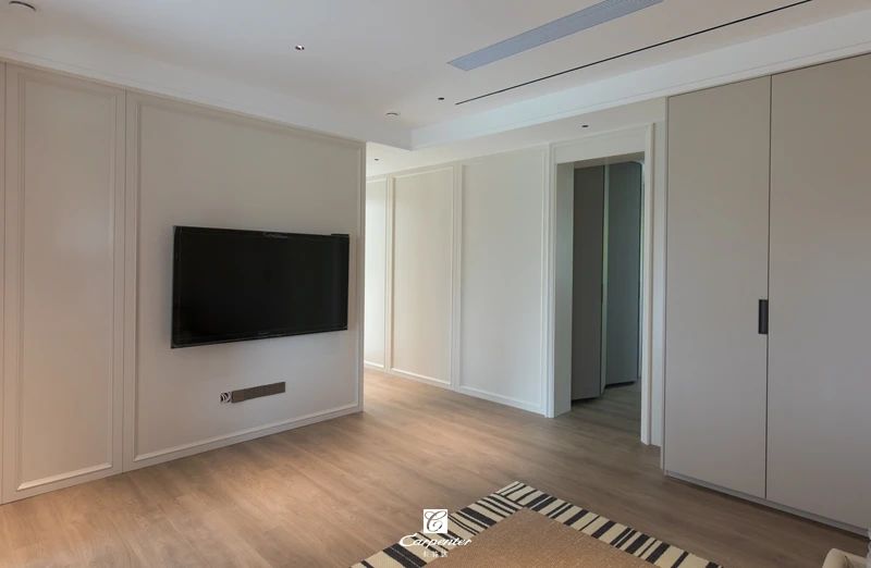 背景墻采用可可蛋奶色混油護(hù)墻板